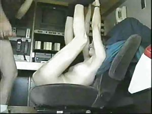 苗条的黑发做了一个口交, 她的男朋友, 并得到了一个家伙与他在椅子上