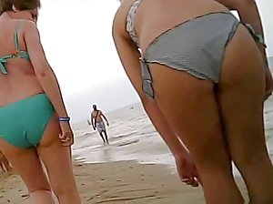 在海滩上隐藏的摄像头的镜头里, 裸体的男人和女孩