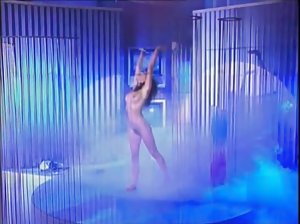 晒黑的裸体的家伙和女孩沐浴在瀑布下